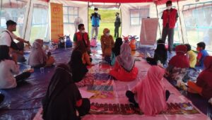 Dalam kesempatannya, selain berdialog langsung, Sutinah juga memberikan dukungan dan support kepada anak-anak pengungsi.