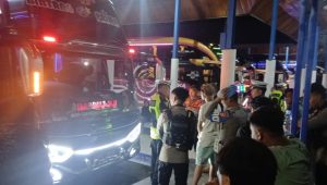 MAMUJU — Tim Satgas Operasi Zebra Marano 2025 Polresta Mamuju bersama petugas Terminal Tipe A Simbuang melakukan uji kelayakan armada bus Antar Kota Antar Provinsi (AKAP) di Terminal Simbuang sebelum keberangkatan ke Makassar, Jumat malam (21/11/2025).