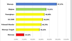 Kabupaten Mamuju menjadi daerah dengan capaian tertinggi, yakni 97,4 persen, disusul Majene dengan 72,4 persen dan Pasangkayu sebesar 68,1 persen. Sementara itu, Polewali Mandar (60,7 persen), Mamuju Tengah (56,3 persen), dan Mamasa (19,3 persen) masih berada di bawah target nasional.