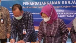 Mamuju – editorial9 – Dalam rangka kerjasama pengembangan kerajinan daerah, mendukung kemudahan akses pembiayaan bagi UMKM serta peningkatan produksi dan akses pasar UMKM kerajinan di wilayah Sulawesi Barat, Kepala Perwakilan Bank Indonesia (BI) Sulbar, Budi Sudaryono, bersama Ketua Dekranasda Sulbar, Andi Ruskati Ali Baal, secara resmi menandatangani nota kesepahaman, di Rujab Gubernur Sulbar, Minggu, 20/06/21 lalu.