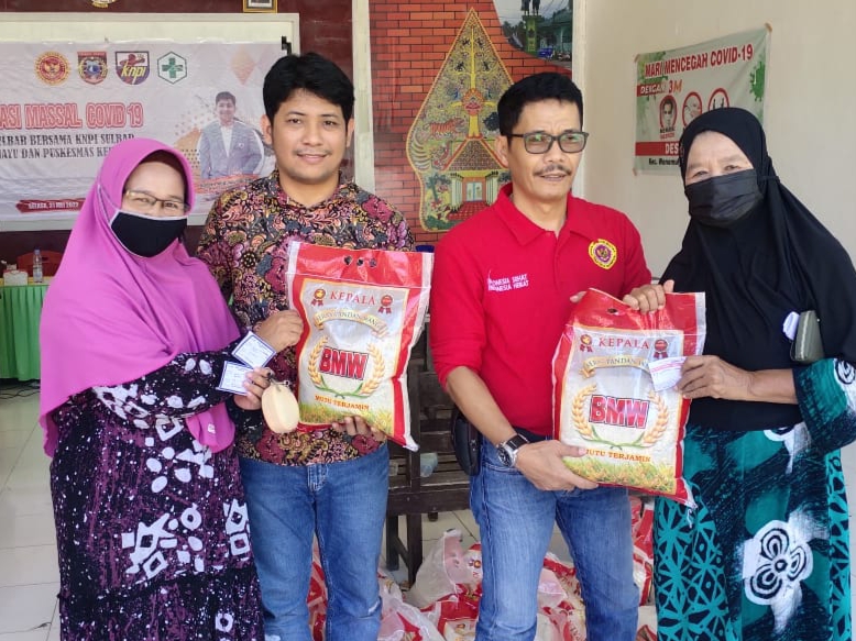 Serah terima sembako, kepada peserta vaksinasi Covid19 di Kantor Desa Bumiayu, oleh perwakilan KNPI dan Binda Sulbar.