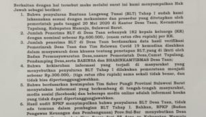 1. Bahwa penyaluran Bantuan Langsung Tunai (BLT) tahap satu sudah kami laksanakan sesuai dengan mekanisme dan prosedur yang ditetapkan oleh pemerintah pada tanggal 20 Mei 2020 di Kantor Desa Taan, Kecamatan Tapalang, Kabupaten Mamuju, Sulawesi Barat.