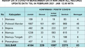 Mamuju – editorial9 – Tim Satgas penanganan dan pencegahan Covid19, Provinsi Sulawesi Barat, kembali merilis update terkini penyebaran virus Corona, 04/02/21.