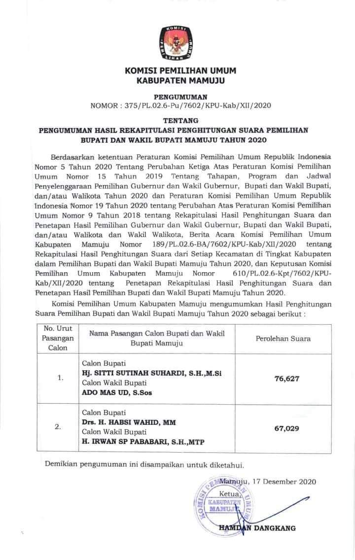 Berdasarkan surat KPU Kabupaten Mamuju, Nomor : 375/PL.02.6-Pu/7602/KPU-Kab/XII/2020, tentang pengumuman hasil rekapitulasi penghitungan suara pemilhan Bupati dan Wakil Bupati Mamuju Tahun 2020, Paslon nomor urut 1, Sutinah Suhardi-Ado Mas’ud (Tina-Ado) unggul setelah sukses meraih suara 76.727 (53,34%), sementara Paslon nomor urut 2, Habsi Wahid -Irwan Pababari (Habsi-Irwan), meraih 67,092. (46,66%).