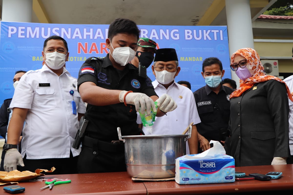 Polman – editorial9 – Gubernur Sulbar, Ali Baal Masdar (ABM), bersama Ketua DPRD Sulbar, Suraidah Suhardi, menghadiri pemusnahan barang narkotika yang dilakukan oleh BNNP Sulawesi Barat di BNNK Polman, Rabu, 28/04/21.