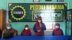 Mamuju – editorial9 – Pengurus Badan Kontak Majelis Taklim (BKMT) Sulbar, mengunjungi warga terdampak gempa bumi di Desa Tapandullu, Kecamatan Simboro, Mamuju, Rabu,03/03/21.