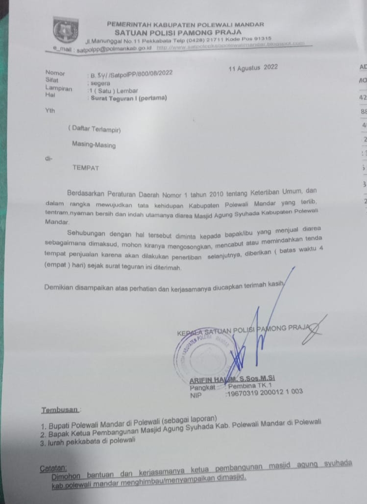 Pernyataan itu disampaikan, menyusul diterimanya surat teguran pertama, nomor : B.341/SatpolPP/800/08/22, per tanggal 11 Agustus 2022, yang diteken oleh Kasatpol PP Polman, Arifin Halim.