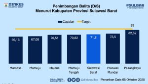 MAMUJU – Upaya Pemerintah Provinsi Sulawesi Barat dalam meningkatkan partisipasi penimbangan balita menunjukkan hasil menggembirakan. Berdasarkan data per 5 Oktober 2025, capaian penimbangan balita (D/S) di Sulbar telah mencapai 71,8 persen, dengan Kabupaten Pasangkayu mencatat capaian tertinggi 82,52 persen, sementara Mamasa masih perlu penguatan dengan angka 66,16 persen.