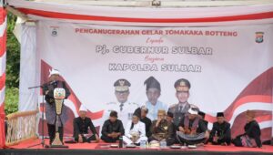 Sulbar – editorial9 – PJ Gubernur Sulbar, Akmal Malik bersama Kapolda Sulbar Irjen Pol Veridanto I Bitticaca, dianugerahi sebagai Tomakaka Malaqbi, oleh masyarakat adat Botteng di Mamuju.