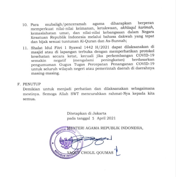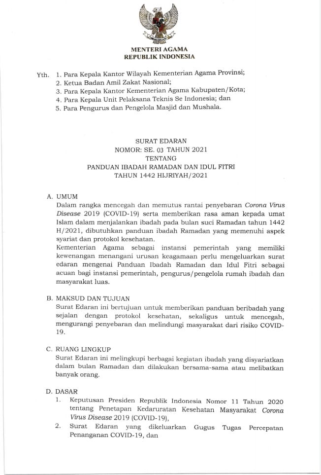 Jakarta – editorial9 – Kementerian Agama Republik Indonesia (Kemenag-RI), menerbitkan surat edaran tentang paduan ibadah di bulan suci Ramadhan dan Idul Fitri 1442 H/2021 M, dimasa pandemi Covid19.