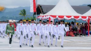 MAMUJU – Pasukan Pengibar Bendera Pusaka (Paskibraka) Provinsi Sulawesi Barat sukses menjalankan tugasnya dalam upacara peringatan HUT ke-80 Kemerdekaan Republik Indonesia tingkat provinsi. Mereka tampil penuh disiplin saat mengibarkan maupun menurunkan Sang Merah Putih di Anjungan Pantai Manakarra, Mamuju, Minggu (17/8/2025).
