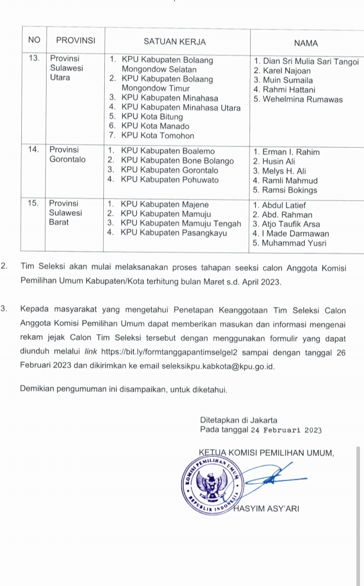 Hal itu berdasarkan pengumuman KPU-RI nomor : 4/SDM.12-PU/04/2023, tentang Tim Seleksi Calon Anggota Komisi Pemilihan Umum pada 118 kabupaten/kota, di 15 provinsi se Indonesia, periode 2023-2028.