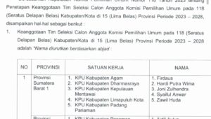 Hal itu berdasarkan pengumuman KPU-RI nomor : 4/SDM.12-PU/04/2023, tentang Tim Seleksi Calon Anggota Komisi Pemilihan Umum pada 118 kabupaten/kota, di 15 provinsi se Indonesia, periode 2023-2028.