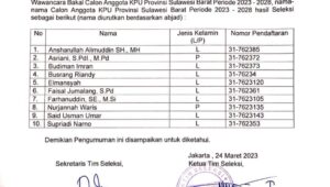 Hal itu tertuang dalam pengumuman Nomor: 28/TIMSELPROV.GEL.1-Pu/04/76/2023. yang ditandatangani Ketua Timsel KPU Sulbar, Amiruddin Pabbu dan Sekretaris Timsel, Dewi Hesti Handayani, Jumat, 24/03/23.